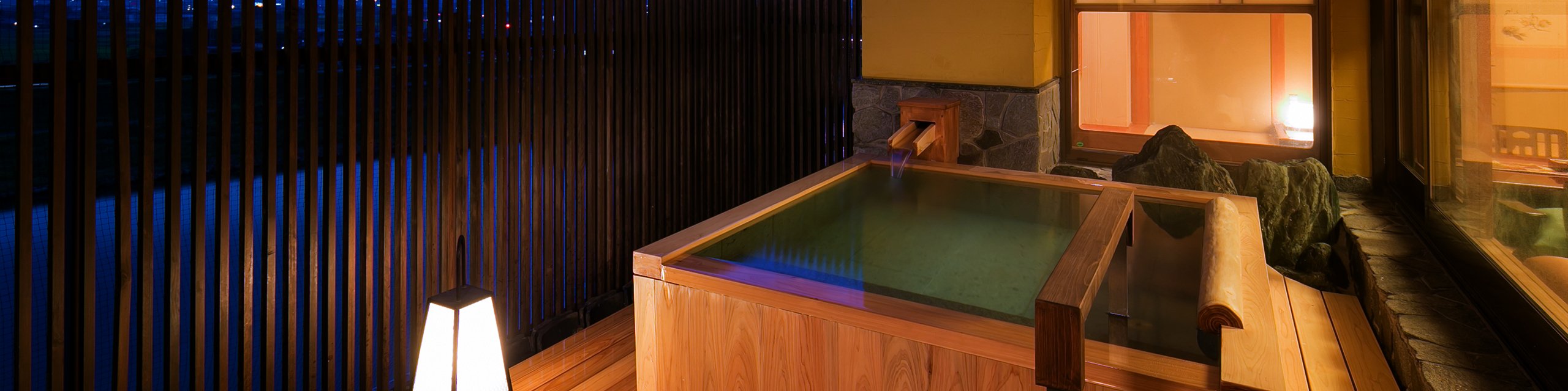筑後川の景色を一望できるロケーションの檜の温泉が備わっております。